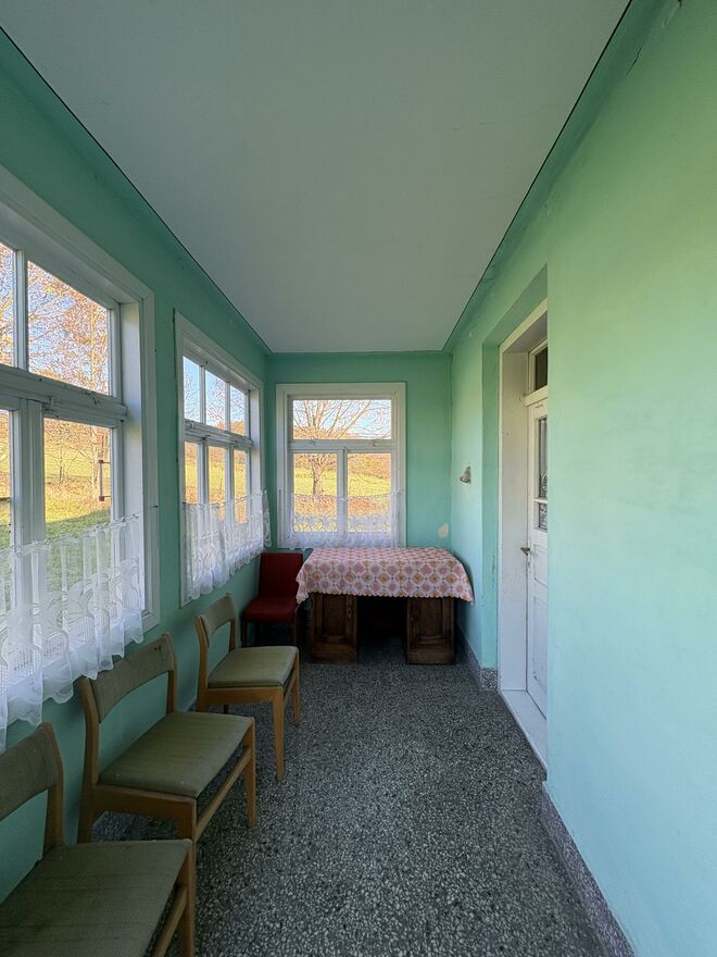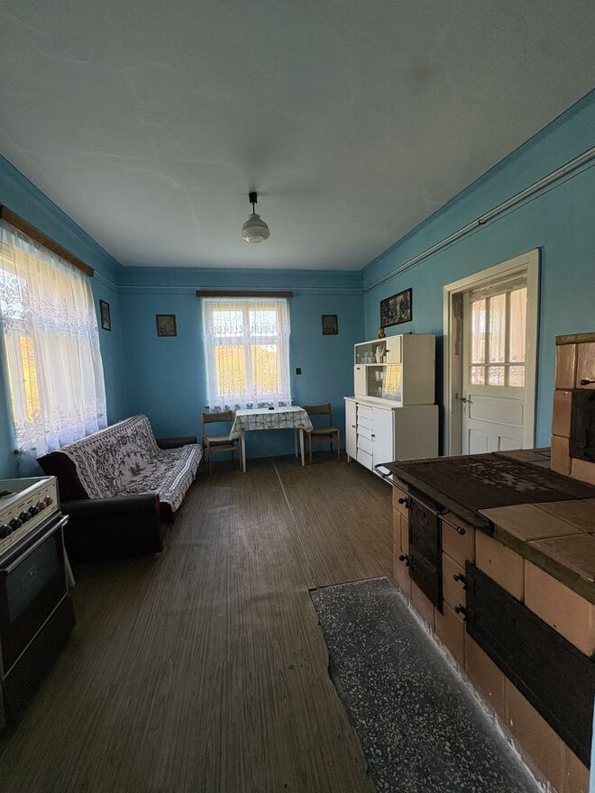układ pomieszczeń: ganek, korytarz, łazienka, pomieszczenie gospodarcze, kuchnia z piecem kaflowym i kuchenką gazową, jadalnia, salon oraz sypialnia